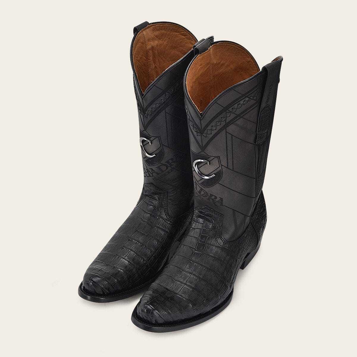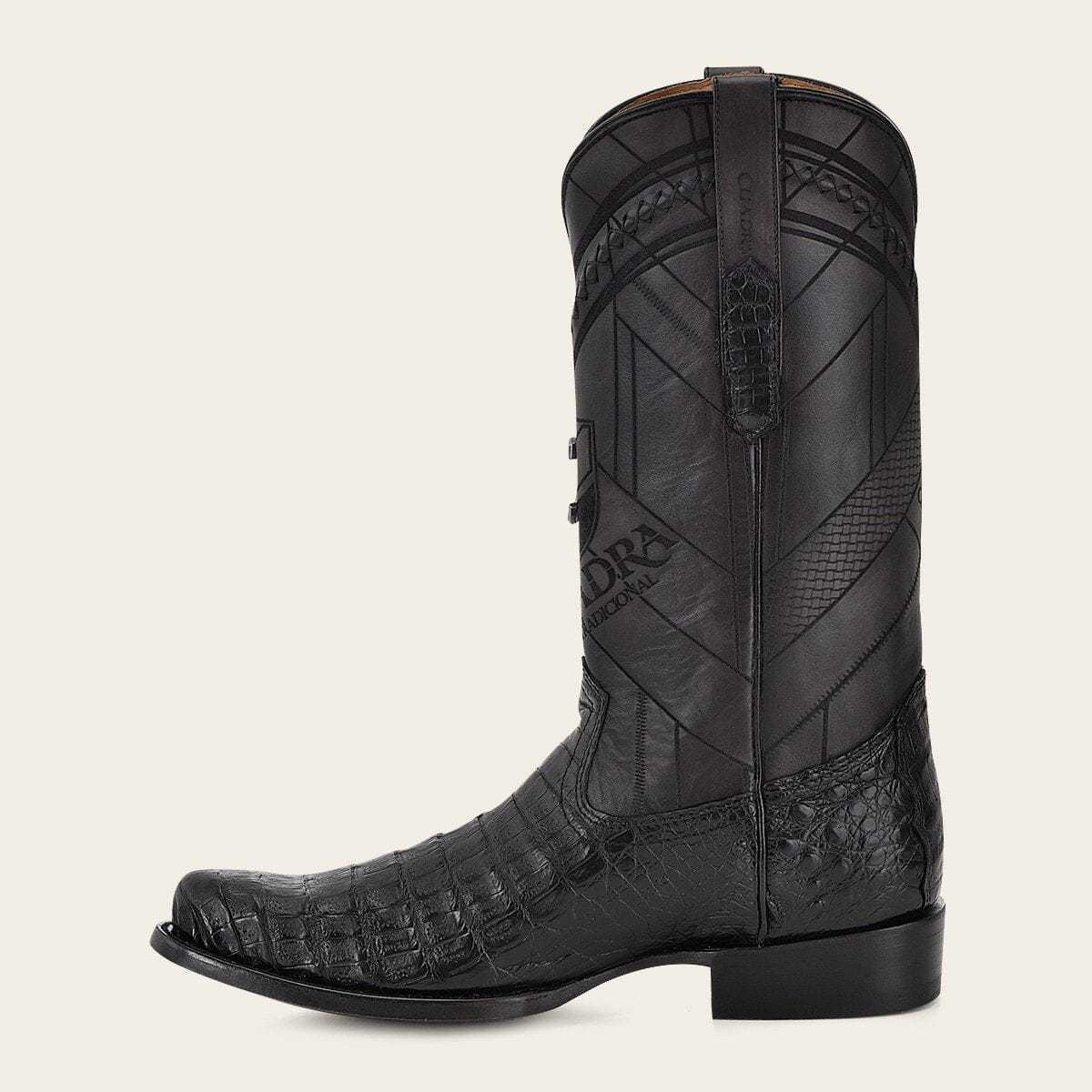Bota vaquera para caballero en piel genuina de caimán fuscus y piel de bovino. Presenta grabado láser en motivos geométricos sobre el tubo, aplicación metálica de monograma Cuadra al frente, detalles de bordado y grabado de logotipo Cuadra. Con orejas en los costados con aplicaciones en piel de fuscus. Suela de cuero con injerto de TPU.